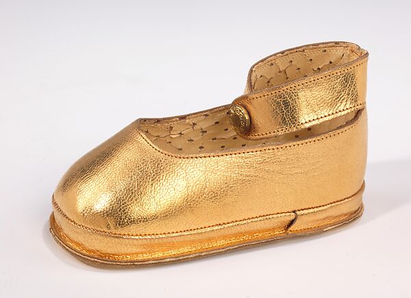 In a play on the concept of the bronzed baby shoe, this single ankle-strap shoe uses an untraditional material to amusing effect. By stylizing the basic form with a widened strap and platform sole, the shoe's designer has bestowed an explicitly humorous tone to the strangely logical, albeit atypical, choice of metallic leather. The bronzing of baby shoes became a well known practice in the 1930s and expanded greatly in the post-war period. The designer of this shoe has created a witty conundrum: shall the already "bronze" baby shoe be bronzed? Further, if the bronzed baby shoe is a preserved memory, is this shoe then a purchased memory, complete without ever being worn? This shoe was saved by the footwear designer Margaret Clark of Margaret Jerrold, Inc., who may have appreciated its ironic overtones.