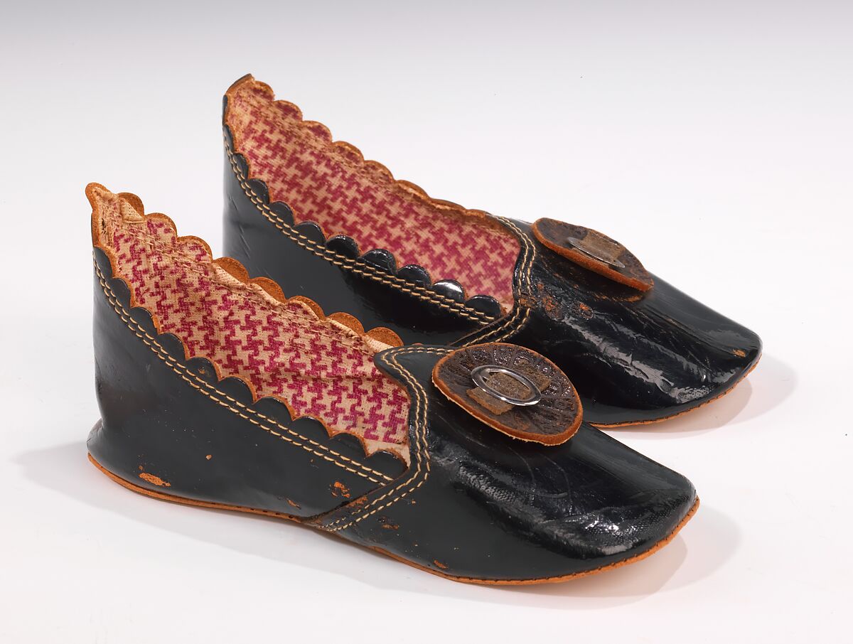 An attractive and unusual design specific to its period distinguishes this pair of shoes worn by an infant girl between 1871 and 1874. The high peak at the back is a feature of fashionable contemporary women's shoes. Numerous attractive details - scalloped quarters, wave design of tab, embossed rosette trimmed with tiny buckle, double row of contrasting top stitching, and cheerful printed lining - create appeal in these inexpensive manufactured shoes.