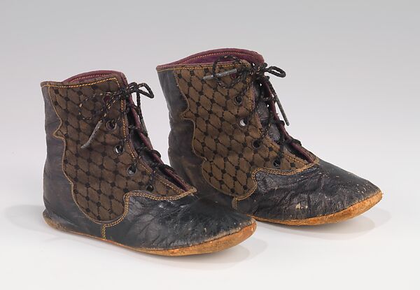 Owing their style to prevailing taste in womenswear, this unusually elaborate pair of child's ankle boots features patterned fabric insertions set under a fancy serpentine cutout, highlighted with topstitching. Cutouts were an important trend in women's boots at the time, sometimes in very elaborate Art Nouveau motifs. The use of patterned woven fabric is also a notable contemporary element, as is the preference for dark colors. Within a few years, all of these elements would be distinctly unfashionable.