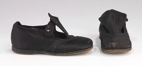 An interesting confluence of a child's Mary Jane and a women's T-strap is evident in this pair of girl's shoes. The particular design of the T-strap, employing a large topstitched flaring tab which is cut to extend as narrow curved bands down to the sole, was a feature of women's styles of the mid-1920s. The basic shape, however, is a direct expression of the classic girl's Mary Jane style with its wide round toe, flat heel, and buttoned instep strap.
