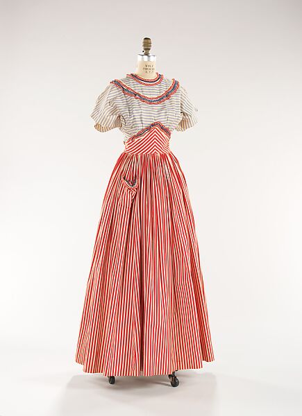 As a successful designer in the 1940s, Adrian proudly helped to build the reputation of American fashion during that decade. After a prolific career designing Hollywood film costumes, he began designing for his own label in 1941. Adrian celebrated simple, American-made fabrics in his designs, frequently using gingham or simple organdy for evening, as well as daywear. Here, the designer paired red and white striped cotton with red, white and blue eyelet to create a dress that embodies both his own aesthetic and post-war American patriotism.