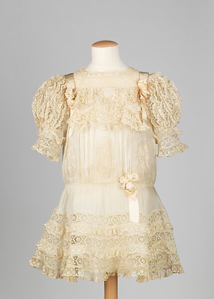 Featured here is a very elaborate girl's dress due to the great amount of detail which is quite typical of the Belle Époque period. The lace band has been manipulated into various ruffles, swags, sleeves and insertions, while the ribbon is manipulated skillfully into rosettes. This is an extremely refined and very opulent piece for a young girl.