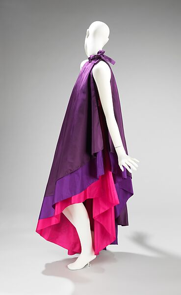 Madame Alix Gres' career spanned five decades and throughout them all she excelled in her ability to manipulate fabric and use its innate characteristics to enhance her designs. Best known for her classically inspired form-fitting evening gowns in silk jersey, in the mid-1960s, Grès began experimenting with geometrically cut pattern pieces to create more free-flowing designs. Using the lightweight but slightly stiff quality of silk taffeta, the semicircular layers of fabric give the garment a sense of freedom and movement as they flutter around the fitted underdress. The use of bright colors further enhances the sense of vibrancy.