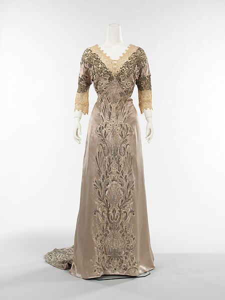 First established in the 1890s by the four Callot sisters as a lingerie and lace business, Callot Soeurs evolved into a premier dressmaking house in the early years of the 20th century. The garments from Callot Soeurs in the Brooklyn Museum collections incorporate the signature elements of the house: antique lace trimming, Orientalist textiles, lavish embroidery that includes bead- or ribbonwork, or a combination of these elements. The materials used in this gown from 1906-1910 enliven a conventional silhouette. The overall design and varying scale of the embroidery parallels the shape of the dress, and the use of lace, in particular the charming animal and bird motif lace of the sleeves, sets this dress apart from others of the same period in the Brooklyn collection. While the dress lacks a label, these details and the overall quality of the design suggest a Callot Soeurs attribution.