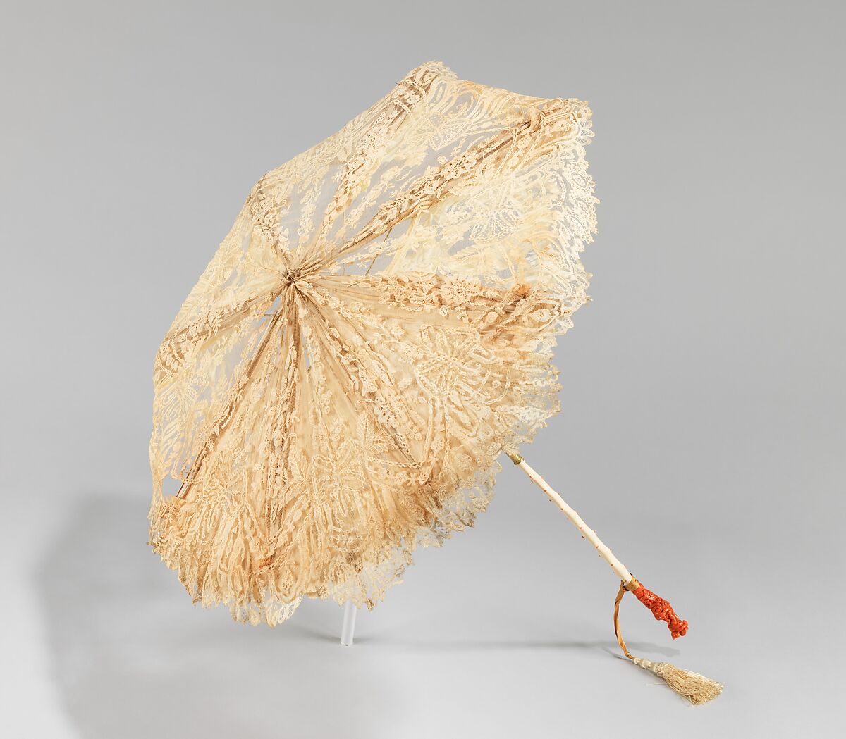 While this parasol is beautiful and of the highest quality, the handle is of particular interest and must be noted. Made of coral, it is intricately carved with fascinating imagery, especially the somewhat grotesque male face that contrasts with the playfully entwined puttee at the top. The ivory stick is made to resemble a bramble and the knots are emphasized with coral color. Coral handles, such as this, were commonly made in Italy.