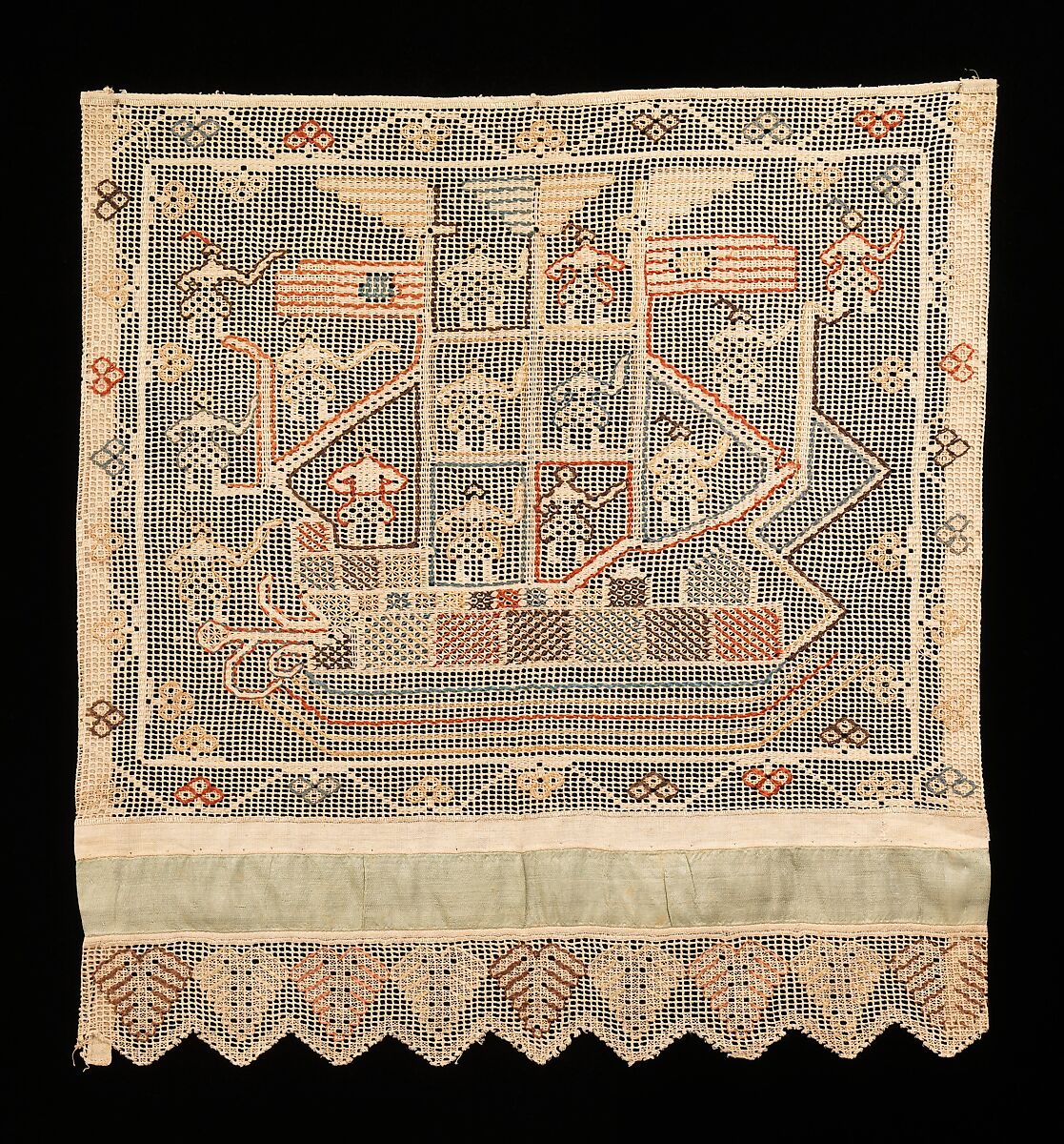 This towel end is unique in that it represents an aspect of everyday life rather than mythology. Russian bed curtains and towels were not only used for decorative purposes, but also provided an important role in ceremony. Bed curtains often adorned sleighs for weddings or carnival processions. Towels were draped over mirrors, trees, and temples, hung on walls, or used as offerings to the church in addition to their traditional uses.