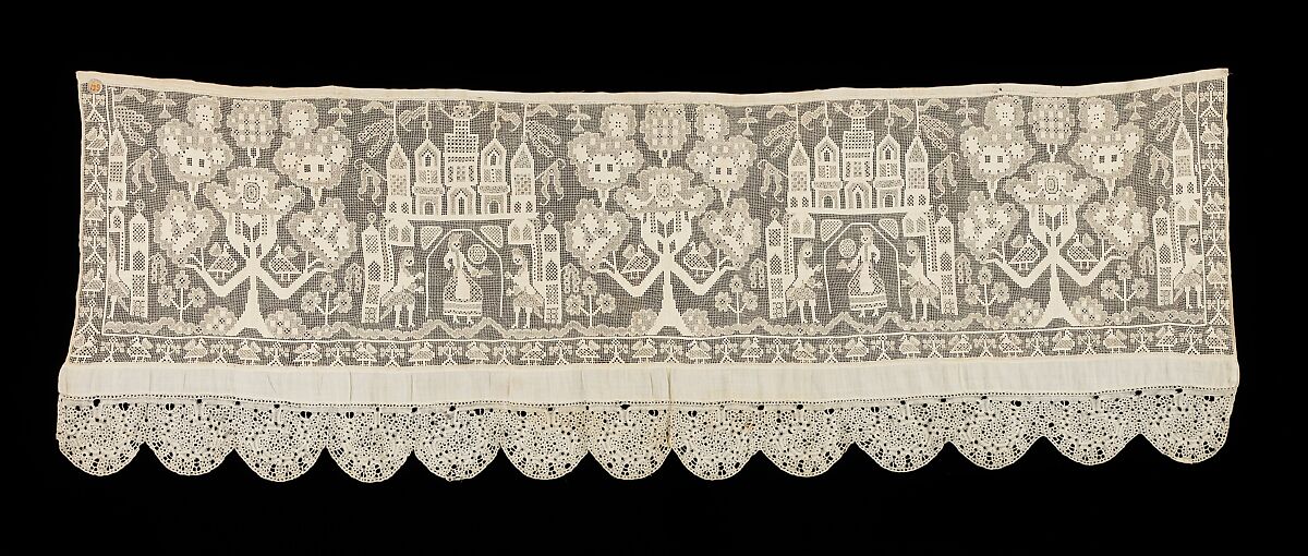 The motifs of this bed curtain border seem to depict reality as opposed to mythology, however the vocabulary of goddess and tree of life designs are evident. The female figure appears to be holding a sun disk, a traditional motif associated with goddess imagery. The birds perched on the tree limbs reference the goddess holding birds aloft in her hands.