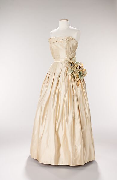 By 1951, Christian Dior had established himself as a designer of note. Editors closely monitored his collections, watching for significant changes to skirt length or silhouette for the coming season. For his 1951 collections, Dior reduced the volume of the skirts in his designs and used princess seaming to elongate the body. In this example, attributed to Dior, the fullness of the skirt at the waist is controlled with box pleats that release at the hip. A finished inner mesh foundation provides a structure for the pliant exterior layer of satin. The floral trim at the waist is comprised of a variety of textiles, organza, velvet and satin in a closely-related palette of yellow-green shades. Such attention to detail indicates the garment is from the Dior atelier.