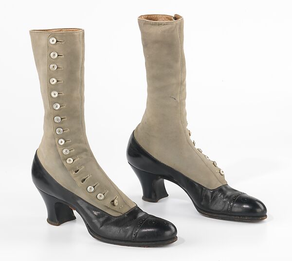 In typifying the fashionable women's boot of 1915-1919, one would likely include several features: Balmoral cut, featuring a buttoned closure with straight fly; boldly contrasting materials, particularly black patent for the vamp paired with a lighter, matte leather for the top; rounded toe with straight toe cap; and mid-calf height leg. Each of these features is present in this pair of classic late 1910s boots. Fuller, shorter skirts had come into fashion in 1915, necessitating a corresponding change in boot height. The patent vamp and light-colored suede top give the appearance of a spat, an effect which seems to have been made more desirable by the contemporary military influence on fashion. The celluloid-covered heel is also indicative of the late 1910s and 1920s period.