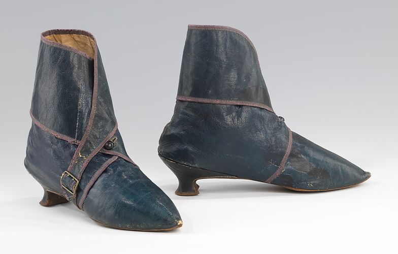 Although still a minority in women's footwear at the beginning of the 19th century, ankle boots would become the dominant style of daytime footwear by the 1830s. This early pair of fashionable boots shoes shows the importance of angular lines, repeated throughout designs and evident from what ever position the boots are viewed. The museum also possesses a similar boot with a small "Italian" heel (2009.300.1487), demonstrating the overlap in styles. The original shoelaces, unlike those now in the boots, would have most likely matched the dark teal color of the leather.