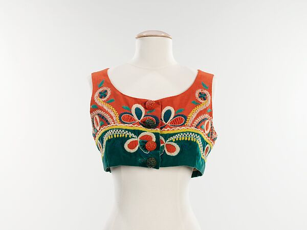 A hallmark of Schiaparelli's design sensibility is her use of interesting, often whimsical closures. The gumdrop-shaped buttons on this lively vest, owned by style connoisseur Millicent Rogers, are a striking example of this habit and a playful addition to a couture garment. The choice of candy as a button is characteristic of Schiaparelli's surreal sensibilities, as if she's tempting one to pluck one off the vest and into one's mouth, just to see if it’s real. The embroidered pattern is also an interesting choice, inspired by colorful Eastern European folk dress.
