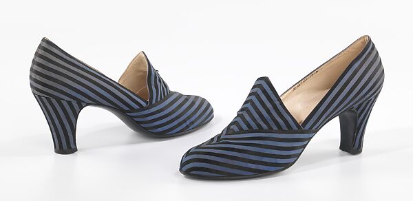 This pair of custom-made shoes features a bold and unusual fabric choice, and was almost certainly made to compliment an ensemble by Elsa Schiaparelli. Striped fabrics were featured in Schiaparelli’s designs for Spring 1939, and the original owner of these shoes, Millicent Rogers, was an avid client. Schiaparelli's shoes were made by Andre Perugia, and while these shoes do not have the Perugia marks one would expect, the style and workmanship do suggest that he may have been responsible for their creation.