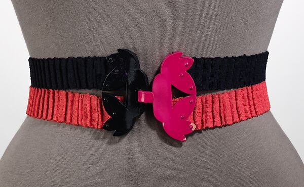 This amusing, unconventional belt in classic Schiaparelli Shocking pink, is a humorous play on elastic garters or suspenders. The buckle, two abstract shapes in contrasting colors made of three layers of plastic laminated together, shows Schiaparelli's interest in experimenting with different types of materials.