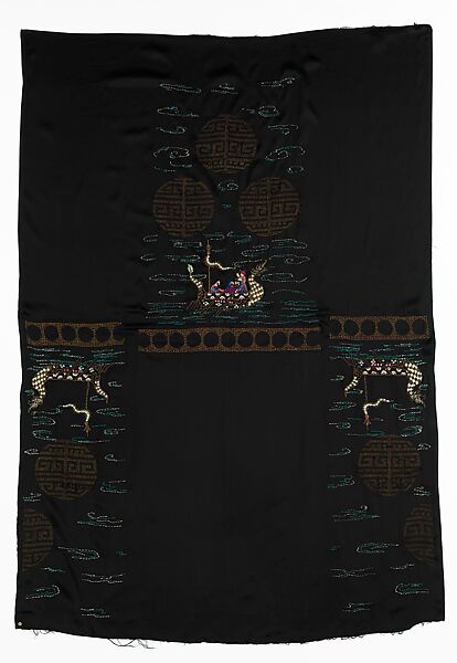 Unlike some of the other samples in Crawford's collection which simply display a type of embroidery, this example is an unfinished jacket. The placement of the embroidered sections allows the viewer to visualize the process of making a garment. The Asian-inspired motifs, including a couple riding in a junk to the beating of a drum and Chinese-inspired medallions, and the kimono styling are illustrative of the interest in non-Western cultures of the period.