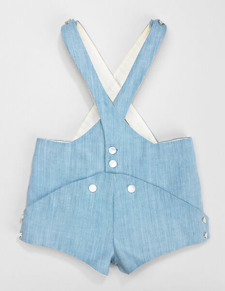 James debuted his line of infants’ wear at his Salon in October 1956, modelled by his 8-month-old son, Charles Brega Haweis James, and a coterie of small, red, full-bellied mannequins. The clothes he showed were marked by graceful shaping, precise cut, and refined seaming, as seen in this infant’s playsuit. James considered all practicalities, designing this playsuit with curved, crossing straps, cut in one with the front panels, that fit to the body and stay in place, and with diaper-front shorts that open to lay flat for ease of ironing. Its curved fronts follow the lines of a child’s rounded belly, while accommodating and hiding the bumps of diapers. This attention to form, fit and functionality reflect James’s pursuit of perfection in all facets of his work.