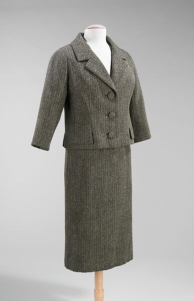 Christian Dior adopted the use of traditional menswear fabrics for women's suits and dresses early in his design career. By 1951, masculine textiles like grey flannel and navy broadcloth had became a staple in Dior collections, yet the designs of the garments made from these fabrics always flattered the female form. When Yves Saint Laurent replaced Dior as the head designer for the house of Dior, he retained these signature menswear fabrics. In this example from 1959, however, it is possible to see a loosening of the ultra-fitted tailoring Dior used. Saint Laurent recognized the aesthetic of the 1950s would not carry into the 1960s and moved the house forward with slightly more relaxed versions of Dior classics like this.