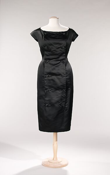 A classic sheath from Christian Dior's 1955 fall collection, this cocktail dress illustrates the designer's subtle appropriation of menswear styling. The glossy black satin recalls the lapel facing of a man's tuxedo, as does the double-breasted effect created by the self covered decorative buttons. Dior never forgets his client's femininity, however. The silhouette hugs her curves, with the boatneck calling attention to her neck and collarbone. Yves Saint Laurent returned to this notion of a tuxedo for women in 1959 with two dresses for Dior now in the Brooklyn Museum collection (2009.300.362a–d and 2009.300.20a, b) and again in the 1970s with his well-known "le smoking" ensembles.