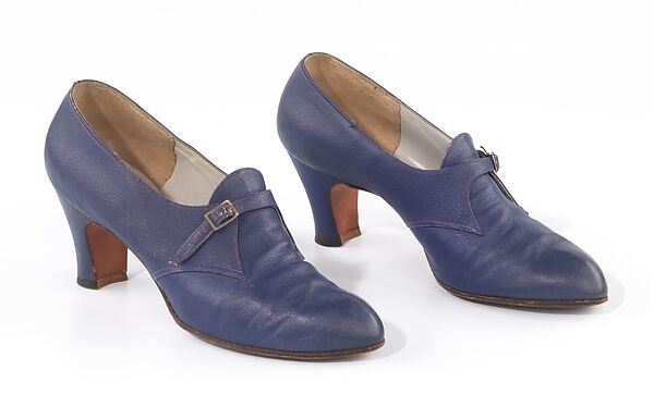 Practical, mannish shoes were particularly strong in the early and mid 1930s, when the somber tone of the Depression years called for serious shoes. In order to feminize the classic designs, designers would often use high heels, cutouts, or - as in this example - color. This periwinkle color is quite unusual, and not surprisingly, the shoes were sold by an expensive store whose patrons could afford to purchase a complete wardrobe of shoes.