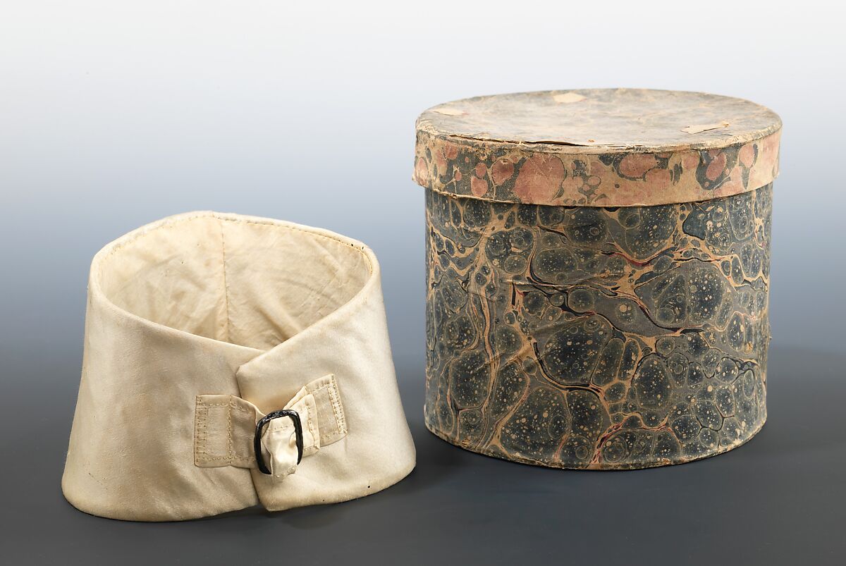 This is a good example of a stock, the standard neckwear for men in the early 19th century, to be worn over the high stand collar of the shirt. A bow would complete the look. It is rare for the original box to survive and indicates that the stock was valuable to the owner.