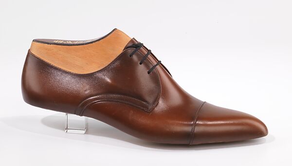 Materials and subtle details combine to bring elegance to this classic design from the Osgood collection. In the post-war period, leather manufacturers developed numerous new color and finish options, including the antiqued finish featured here. The beauty of the leather on this sample for the Kid Leather Guild is allowed to take precedence by the exercise of restraint in the detailing. The curved lacing stay is a stylish touch, which is complemented by the emphatically topstitched curve of the side seam. The shape of the last, with its elegant, elongated lines and shallow pointed toe, is characteristic of Italian styles of the period.