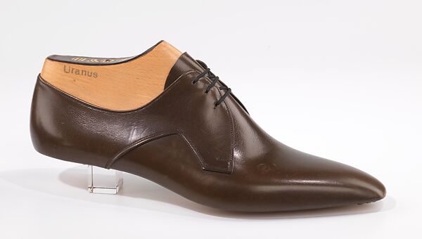 Following the same approach as the other Lloyd prototypes in the Osgood collection, this design makes a twist on a traditional form by transforming a basic component into a bold focal point. In this instance, the seam between the vamp and quarters is modified to become a decorative element. The designer has cut a deep V-shaped notch into the front line of the quarters, and further accentuated the feature by piping the seam. Although this prototype is unsoled, the seam line is positioned so as to form a continuous line with the heel breast, a further indication of the thoughtfulness and refinement of the design. The chisel toe is advanced for this date, but not unexpected on an Italian design prototype.