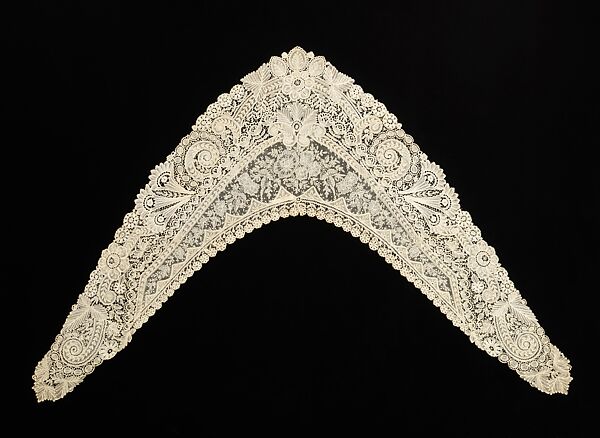 Many examples of this kind of lace survive. The exuberant trumpet flowers, seeming to burst from their confines, and the curvaceous scrolls, all beautifully configured to the shape of the object, set this example apart from the norm.