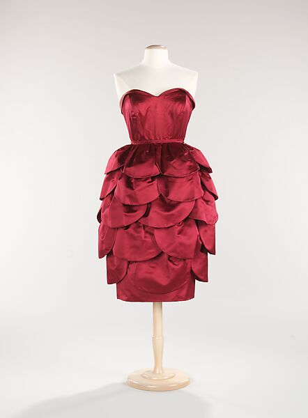 This flattering ruby red satin cocktail ensemble is an excellent example of Mainbocher's later work. The strapless dress, with tiers of self petals is extremely feminine and the cut of the dress is pure perfection. The jacket finishes the piece, making it appropriate for all occasions. The collar frames the face and the wrap style slenderizes the silhouette.