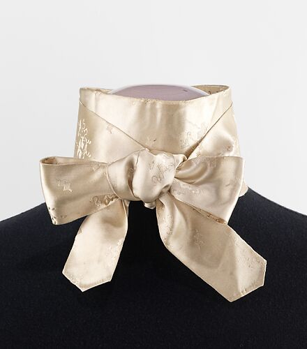 This is an elegant example of a stock, the standard neckwear for men in the early 19th century, to be worn over the high stand collar of the shirt. The styles of the 1830s were prescribed by fashionable dandies, such as Alfred Guillaume Gabriel, Count D'Orsay (1801-1852), a French emigrant who had relocated to England in 1829, and influenced artists and writers in wit and dress. The crisp and complete stock with a tailored bow was essential in fashionable formal dress.