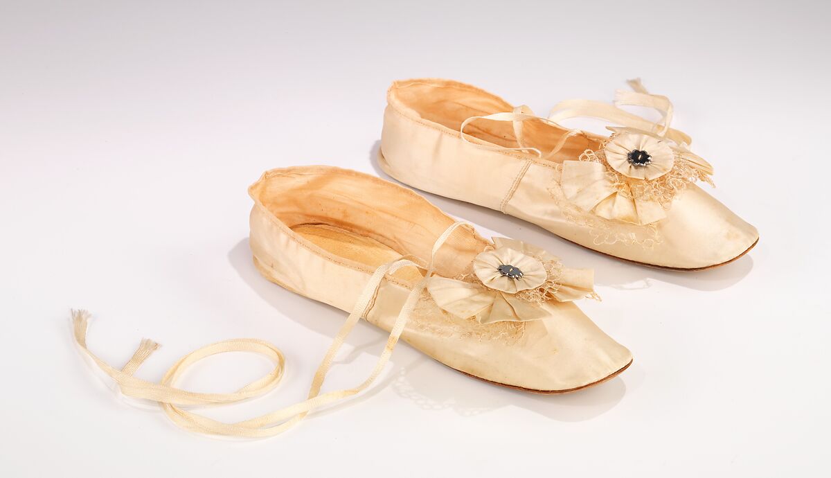 Even as heels began to come back into fashion in the 1850s, the prevalent choice of brides was the flat, heelless slippers that had been worn for nearly half a century. Changes in toe shape, throat depth and shape, and trimming distinguish the slippers of one date from another. This pair wedding shoes are adorned with a large and elaborate combination bow/rosette accentuated with web-like lace, a form of trimming which was stylish in the late 1850s and early 1860s.
