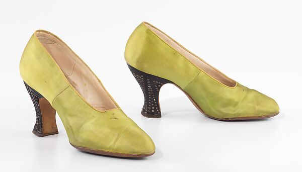 Plain black celluloid-covered heels appeared in the late 1910s. Around 1925, jeweled celluloid heels became the rage on evening shoes. Typically, the heels were set with rhinestone and picotage (tiny metal dots) in geometric Art Deco designs, and paired with a colored satin upper. On better examples, the design of the upper fabric might be coordinated with the heel, or colored, marbled, or faux tortoise celluloid used instead of black.
