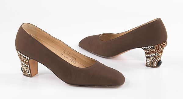 Jeweled heels were an important fashion trend in the later 1920s, and reappeared occasionally thereafter. The Italian shoemaker Samo seems to have made rather a specialty of the style when it returned to fashion in the later 1960s. Much like the high-fashion evening dresses of the period, the tendency was to use a contrast of plain fabrics and bursts of robust trim or pattern.