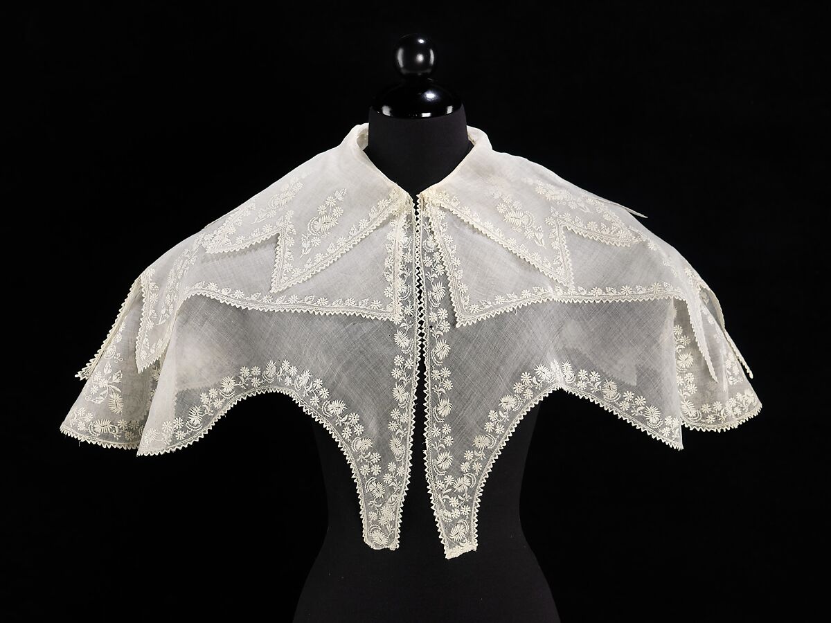 This is a quintessential example of the multi-tiered pelerine collars of the 1830s that lay on top of the large gigot dress sleeves. The combination of floral embroidery, saw-tooth borders and various pointed edges creates a visually compelling effect.