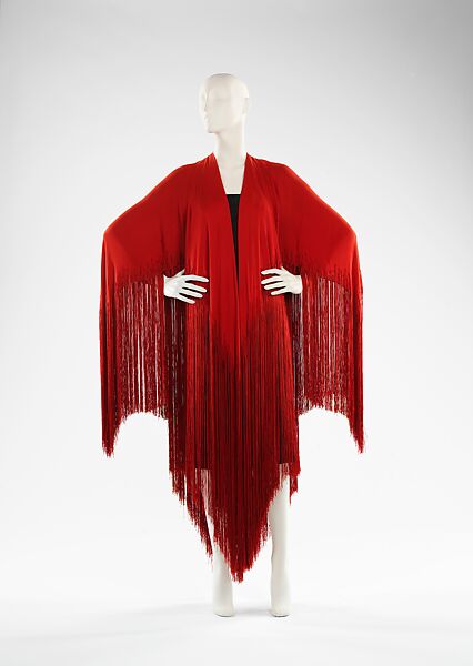 The fringed shawl was a fashion mainstay of the 1920s. In Madeleine Vionnet's hands it receives the benefit of her impressive technical skill. The weight and drapable quality of silk jersey lends itself to the fitted shoulders and interior shaping at the armholes without losing its fluidity. The shawl is cut in an irregular length, which adds to its refinement. The tomato red color is made even more dramatic by the varied placement of the fringe, which is hand-knotted through the fabric. By staggering the fringe knots, Vionnet creates subtle surface decoration along with a sense of movement, the fringe seems to spill out from the surface plane of the fabric.