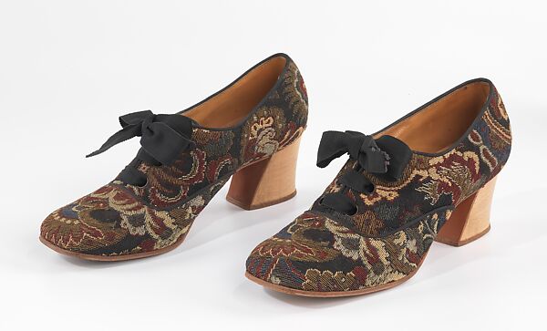 In the mid 1960s, fashion inspiration took an unparalleled turn from the refined aristocratic to the street styles of the hippies. Found vintage garments and accessories were an essential part of the fashionable Bohemian look, and carpet bags and patchwork figured heavily in the mix of styles. The floral carpet pattern of these shoes is a direct response to that aesthetic. Clunky heels, wide toes, and oversize eyelets grew out of the child-like fashions of the mid 1960s, and remained important style features through the early 1970s.