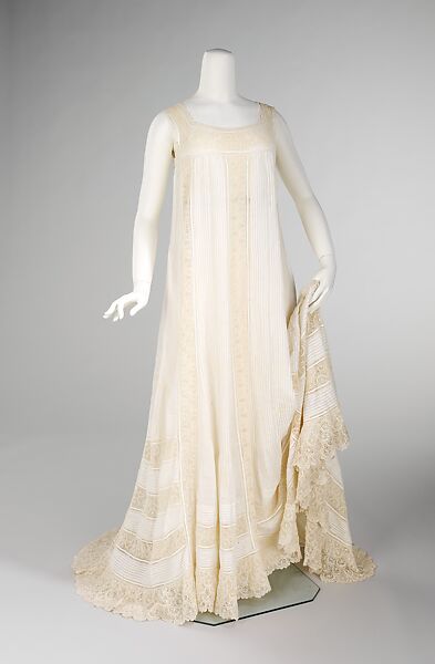 A refined society lady with exquisite taste, this nightgown is an appropriate choice for Mrs. Frederick H. Prince, Jr. The excessive material used for both the length and the skirt's fullness add to its luxuriousness, as does the fine pleating. Also, the abundant use of such high quality lace is a testament to this opulent era.