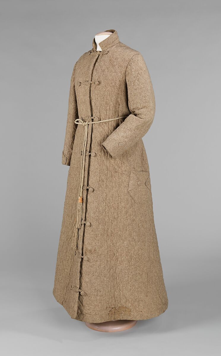 This gentleman's robe is of interest for it exudes a sense of home and warmth. The multi-colored lining enlivens the bland exterior and a sense of exoticism is seen in the use of multiple frog closures and the application of the mandarin-style collar. Finely crafted, the exterior and interior are completely constructed together.