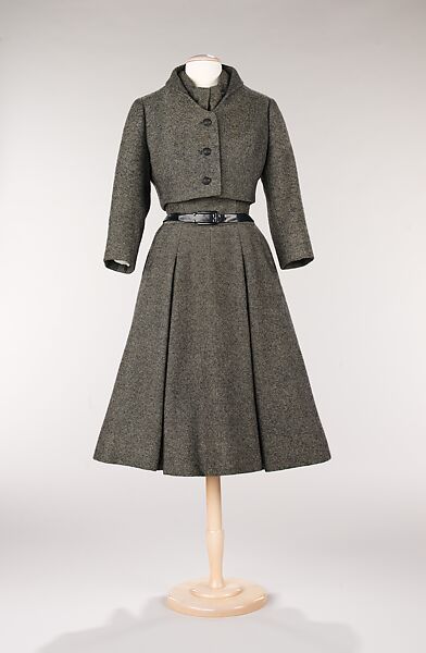 Emphasis on a nipped waist was the primary characteristic of Christian Dior's designs. No matter which silhouette he chose, the slim sheath or the bouffant skirt, the narrow waist recurs in nearly every garment. In some garments, a contrast of proportions makes the waist appear smaller. In others, hip padding or a self belt heightens the effect. This day ensemble features another Dior hallmark, the cropped jacket, to create the same look. Paired with a box-pleated skirt, the jacket skims the waist, accentuating the hourglass shape. This piece, as well as two others, were given to the Brooklyn Museum collection by one of Dior's former models.