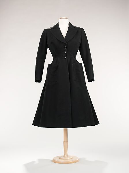 Although Christian Dior had not yet designed a collection under his own name in 1947, he drew upon his experiences as a fashion illustrator and design assistant to create his first collection. Dior called it the "Corolle Line" but editors immediately dubbed it "The New Look" collection and their praise launched Dior's career. This evening coat exemplifies Dior's silhouette of 1947. The hipline has been padded on the interior and further exaggerated by oversized pockets which stand away from the body on the exterior. The midriff is tight and elongated and the shoulders somewhat broad and square. A pleat at the center back allows for even more fullness in the skirt of the coat. The length and fullness of the skirts in this collection heralded the end of the fabric rationing which had had a marked effect on fashion for the duration of the second World War.