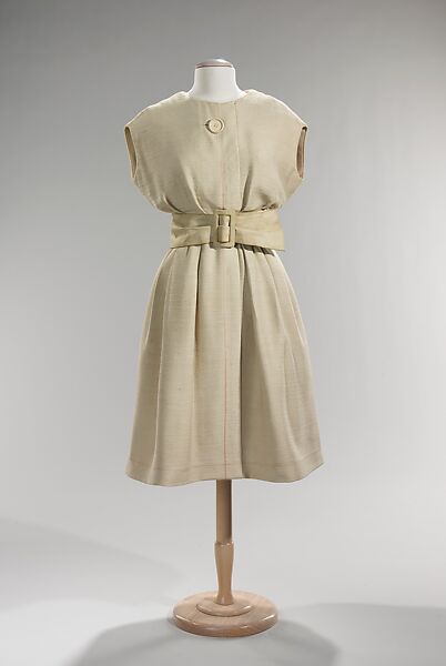 Following his first successful "Trapèze" collection for Dior in 1958, Saint Laurent remained committed to promoting the new shape for garments the following year. The silhouette of this day dress is essentially boxy, with the suede belt providing the definition at the waistline. The dropped shoulders are a marked departure from the precise tailoring of Dior garments from the 1940s and 1950s, but the unfitted cut of the bodice represented a larger shift in fashion, toward a more youthful geometry. The designs of Yves Saint Laurent for Dior helped to convey this change and the new shape became mainstream in the 1960s.