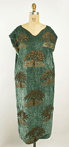 This evening dress is a rare example of the work of Vitaldi Babani. The prevalent interest in Orientalism at the time can be seen in the garment's caftan styling and floral and leaf patterning; both of which are influenced by Middle East designs.