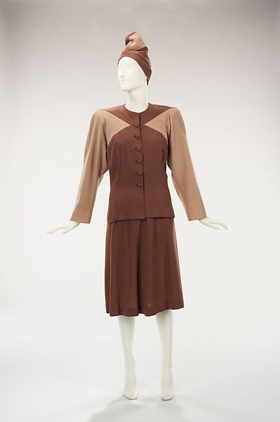 During the 1940s, women's suits were often fitted with shoulder pads to provide interest and excitement to clothing that was affected by war time rationing. Valentina employed that method with this suit, and also utilizes color blocking with similar shades to create an overall refined and interesting effect. The turban-like hat is another signature of the dramatic, exotic Valentina, who sometimes wore a turban herself.