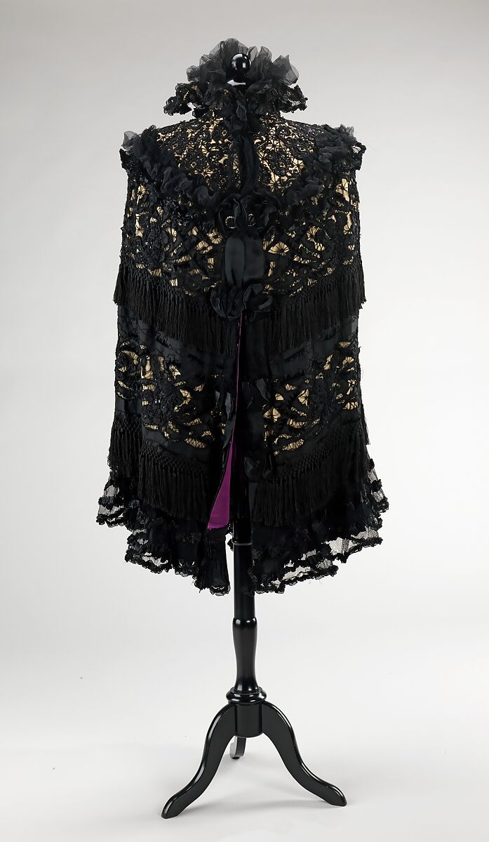 Victorian mourning traditions were complex and circumscribed. Full mourning, with its proscribed all-black clothing, lasted a year and a day, while second mourning, which followed, lasted six to nine months and allowed for some use of trim and small jewelry. Half-mourning lasted three to six months and allowed for more elaborate fabrics and jewelry. This cape is an example of a half-mourning evening garment. It was purchased at Abraham & Straus by Brooklyn resident Florence Madden Adriance (1878-1915), who was the grandmother of the donors.