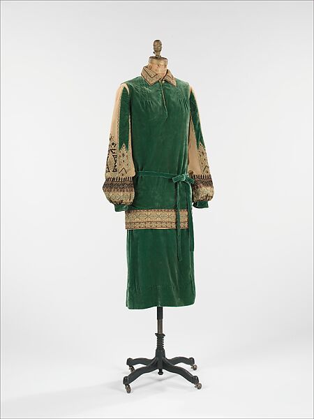 This day dress is of interest for it displays the influence of regional costume. A folklore look, this has been a common design inspiration since the nineteenth century. After the 1917 Bolshevik Revolution, Russian émigrés fled to Paris and found work embroidering their traditional designs for fashion houses. Jean Patou and Coco Chanel were two of the designers that helped to promote this new trend, which became very popular in both Europe and the United States.