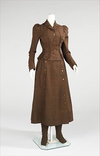 A past time originally dominated by men, bicycling became more acceptable for women after Queen Victoria bought bicycles for her daughters. By the 1890s, clothing to be worn while participating in the activity was being produced. The bifurcated clothing worn while astride a bicycle not only opened the door for women to engage in the sport but also to gain their independence from strict societal rules. This particular ensemble features a patented bifurcated skirt that allowed the rider a more comfortable ride while also giving the modest appearance of the skirt at front. Other more daring ensembles featured fully bifurcated Knickerbockers.