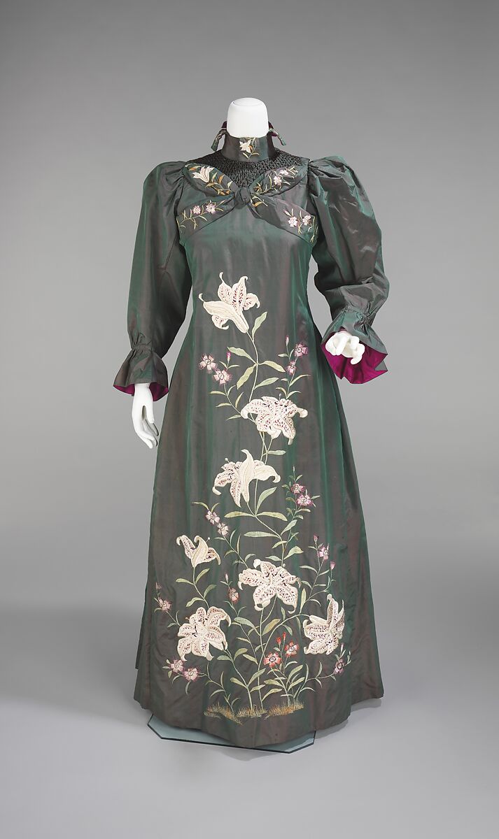A woman wore a teagown to receive guests in her own home in the late 19th and early 20th centuries. These garments were far less formal and structured that typical day or evening wear, and as a result, sometimes show more creative or unusual inspirations, such as historic or non-Western forms of dress. This example is a beautifully made and decorated teagown, which shows the influence of both Japanese embroidered kimonos and 18th century robes à la française. Interior padding intended to provide warmth and the deliberate choice of a magenta lining which picks up the purple details in the lily motifs are both signs of superior design and workmanship. Furthermore, the asymmetry of the embroidery is in keeping with the Art Nouveau aesthetic. While the maker is no longer known, the smocking of the bodice clearly relates to the distinctive Liberty & Company fashions in vogue during this period, and the store might easily have been the source for this unparalleled example.