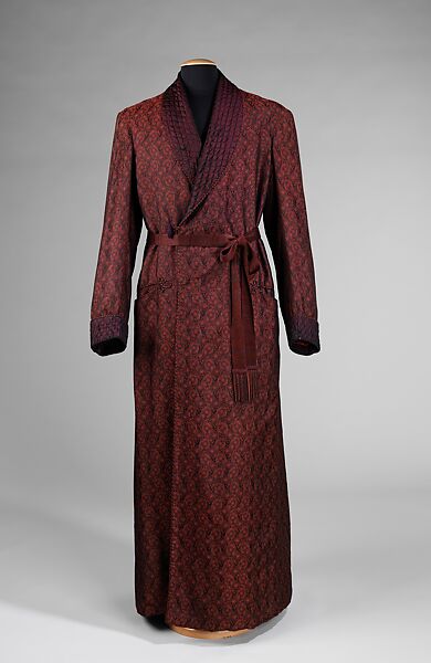 Purchased from a New Bond Street retailer, this robe is a handsome example of high quality men's dressing wear. The paisley pattern, popularized during the eighteenth century, remained fashionable even after the Kashmir shawls on which the design was originally found, did not. The pattern became associated with luxury items, such as fine men's accessories and silk garments. Adding interest to this piece is the knitted belt, an unusual feature, and the refined cord edges.