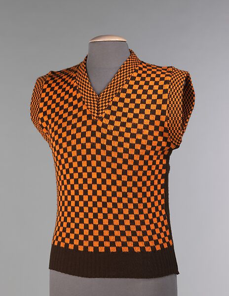 The Peacock Revolution of the mid-1960s drastically changed menswear from the traditional and staid to exaggerated and flamboyant. Suit collars and lapels took on large proportions and shirts and vests became vividly patterned. This vest is a classic example of this British style which ruled fashion at the time. The variation of pattern also references the Op Art movement which utilized optical illusions and perceptual abstraction.