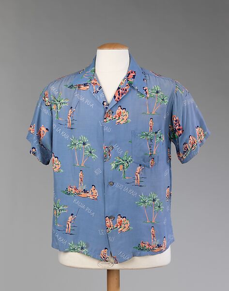 This classic example of the Hawaiian shirt features distinctive Hawaiian words and themes. Bright colors gained a wider popularity after WWII and this shift marks that more relaxed, playful mood in casual menswear.