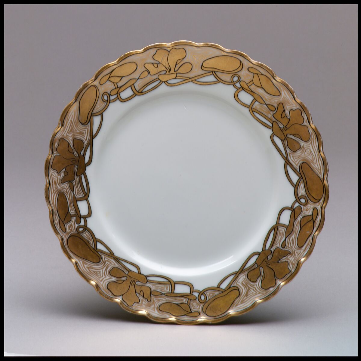 In the second half of the nineteenth-century, highly skilled amateur and professional china painters produced an eclectic array of decoration on imported and domestic porcelain blanks. The artist who painted this pre-fired Haviland plate accentuated its delicately ruffled edges with gold enamel and a stylized border of lily pads thinly outlined in black. This plate is an excellent example of the Art Nouveau decoration popular in the last decade of the nineteenth century and the first decade of the twentieth.