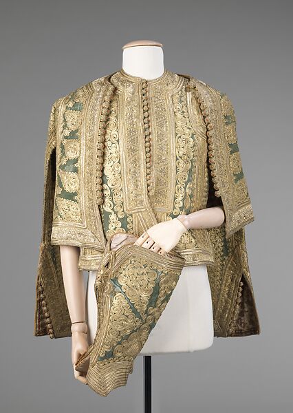 The workmanship of this ensemble, comprised of vest, jacket, and gaiters, is dense, balanced and attractive. The damask lining and coral beads add to its overall rich and festive appearance.
